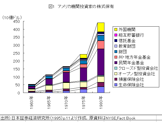 第三に、この議論がアメリカにおいて近年、特に活発になされたということ そこでまず、本報告においては、議論が活発にされるようになった背景から鑑みて、少々長くなる規定ではあるものの、ガバナンスを、以下の如く規定する。つまり、コーポレイト・ガバナンスとは、アメリカの企業社会においては、会社支配権市場の存在によって、テイクオーバーの機能が無能な経営者を排除するといった前提が存在したものの、M&Aブームの中であみだされた乗っ取り防衛策2、さらに1987年のインディアナ州の反乗っ取り法に関する裁判結果を皮切りにノース・カロライナ州、ミネソタ州、ジョージア州等で制定された反乗っ取り法、またカルパース(CalPERS ─カリフォルニア州公務員退職年金基金)等のように、積極的に経営活動に介入する公的年金基金を除く年金基金は近年、機関投資家の中で大きなシェアを占めてきたのであるが(図1)、受動的な行動をとっていたこと等から、株式市場を通じた会社支配権市場自体の有効性が損なわれるようになったこと、もしくは積極的な行動をとってきた公的年金基金の拡大、民間年金基金の90年代に入ってからの積極的行動への移行とともに、このような株主による経営者のコントロールの困難さに対する議論、と規定する。 したがって、多くの場合にいわれる3、株主、債権者、経営者、従業員、取引先等との利害調整を円滑かつ適正に行いつつ、企業経営をいかに行うか、といったことを論じるコーポレイト・ガバナンスとは立場を異にする。 このような見地から、先ず、在外で日本のコーポレイト・ガバナンスについて業績をあげ、宮島英昭(1996)や岡崎哲二(1994)、さらには経済企画庁(1996)4等にもその研究手法を採用されている青木昌彦氏の所論について検討を加え、その主張される状態依存型ガバナンスの問題点を浮き彫りにする。しかる後、充分なる日本企業の支配構造を理解しないでは、コーポレイト・ガバナンスの議論は、ガバナンスの本来の意味を逸脱して、支配論と同じ範疇で看板を替えただけの議論にになってしまうことを指摘する。 結果として、日本におけるコーポレイト・ガバナンスの問題は、国内企業間においては、バブル崩壊の結果、企業が株式持ち合いを維持していくために、もしくは持ち合い解消の結果、株式の受け皿となりうる投資信託、年金信託といった法人投資家が本来の意味での機関投資家となるためには、これまでの投資スタンスを変え、投資先の産業会社の低位安定配当政策をそのまま受け入れてばかりいるわけにはいかなくなったこと、また外国人投資家とっては、大株主かつ筆頭融資元である企業集団所属都市銀行に対する、欧米の機関投資家による所有に基づいた利害の衝突を巡る戦術となった、と位置づける。 翻って、ガバナンス本来の意味から日本企業を論じるならば、株式会社の範疇の中では、 企業集団の中核に存在し、株主はそのガバナンスを半ば放棄、もしくは剥奪され、不完全な形で大蔵省に委託してきたとも言える企業集団所属都市銀行におけるガバナンスを論じなければならないということを提示したい。
