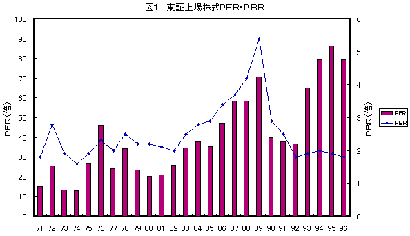 株式投資の際して株価収益率( PER)と株価純資産倍率(PBR)という指標が参考にされる。1971年から96年までの東証上場株式全体でのPERとPBRを示したものが図1である。この図が明らかにしているように、PERの上昇はいわゆるバブル期に特有の現象ではない。バブル期よりも株価は低い現在において当時以上にPERが高いということはそれだけ利益が低いということである。このようにPERは利益の多寡に大きく依存する特質を有する。これに対して、PBRはバブル期に突出していることが明らかである。この期を除けばPERは2−3倍程度に収まっている。純資産も変動するけれども利益の変動と比較すればより安定的である。したがって、株価の高騰時にPBRが異常に高くなるという現象が起きるのである。
